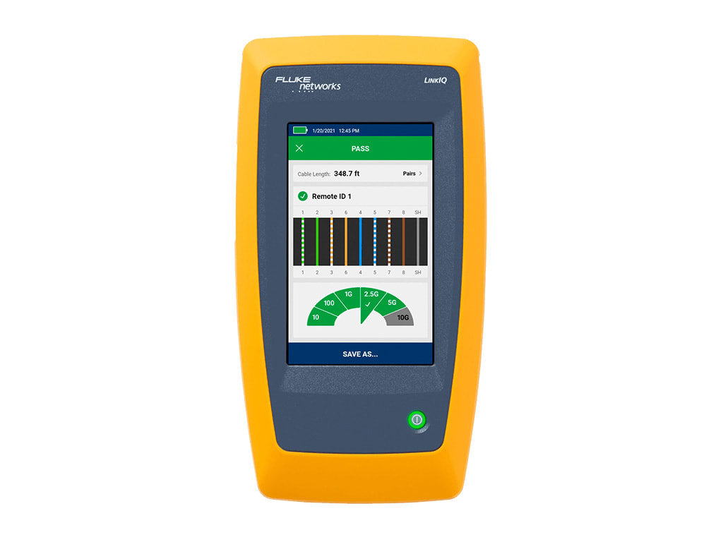 The LinkIQ™ is capable of measuring lengths up to 1000 feet (305 m) and provides distance to faults such as opens, shorts, and unterminated cable. Using the remote ID allows for a complete wire map of the cable pairs which helps identify miswired and split pairs. The primary cable testing feature of LinkIQ™ is the cable performance test which qualifies the cabling bandwidth from 10BASE-T to 10GBASE-T (10 Mb/s up to 10 Gb/s). It performs these tests via frequency-based measurements. Using IEEE-standards-based measurements ensures that tested links meet performance requirements as opposed to transmission testers which only prove that the specific test devices can communicate over the link.
